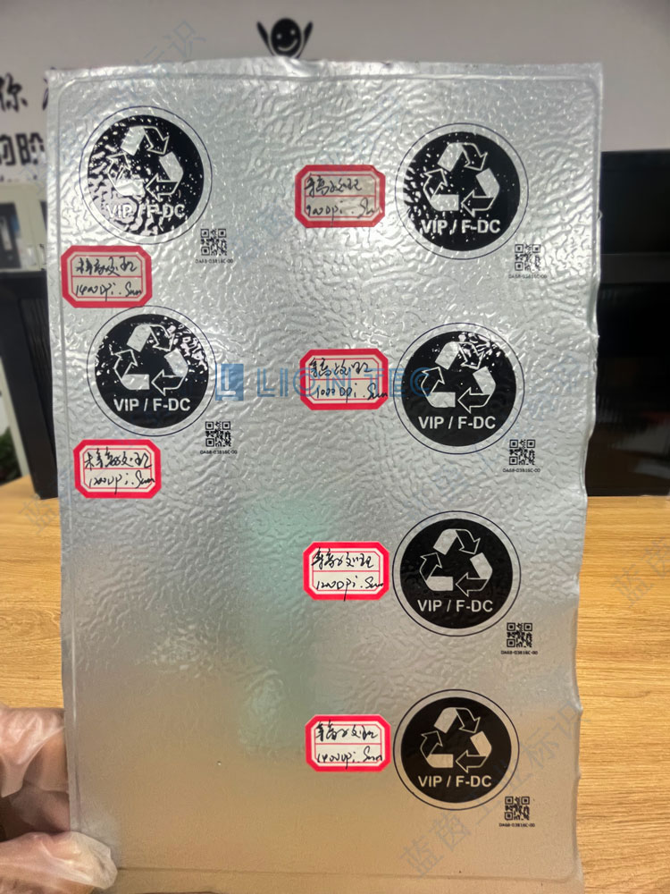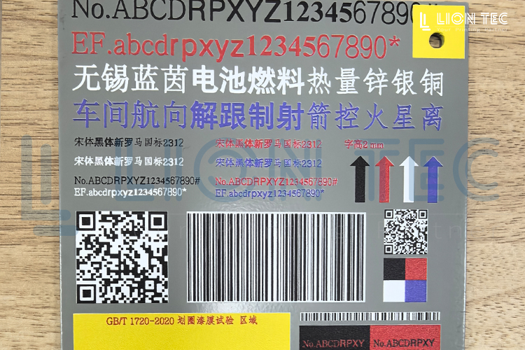 UV噴碼機在軍工不銹鋼鋁板上噴印文字圖案等標識客戶要求:鮮艷 彩色對比度 字體明顯 附著力好 厚度適中同行打樣:字體暗沉 對比度不好 特別是黃色區域 達不到客戶需求我們采用多pass彩色噴印