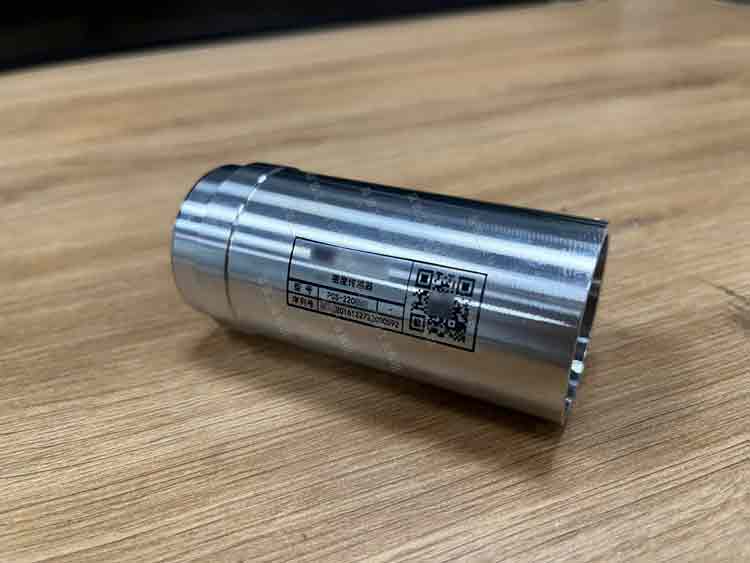 UV噴碼機在不銹鋼圓柱形密度傳感器鋼套鋼管的柱體弧面上進行規格信息、二維碼的噴印,字體效果清晰,二維碼易識別